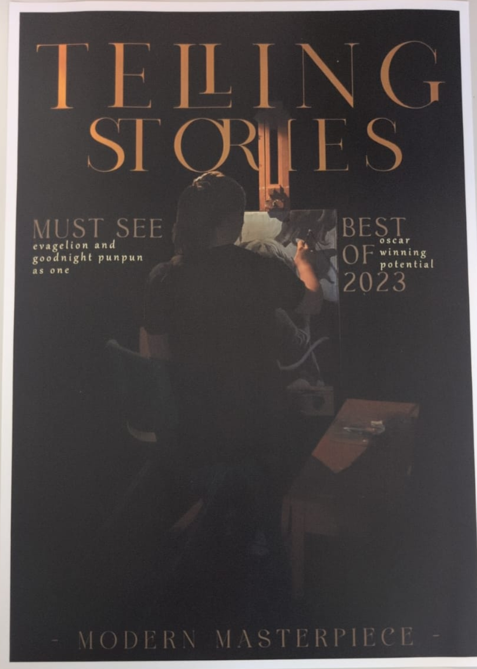 this magazine "telling stores" focuses on a fictional magazine brand made to shine light on upcomming movies by indie film makers. In this spesific case the magazine focuses on a movie telling the story of a student artist struggling with their mental health and how they will move forward in their career.