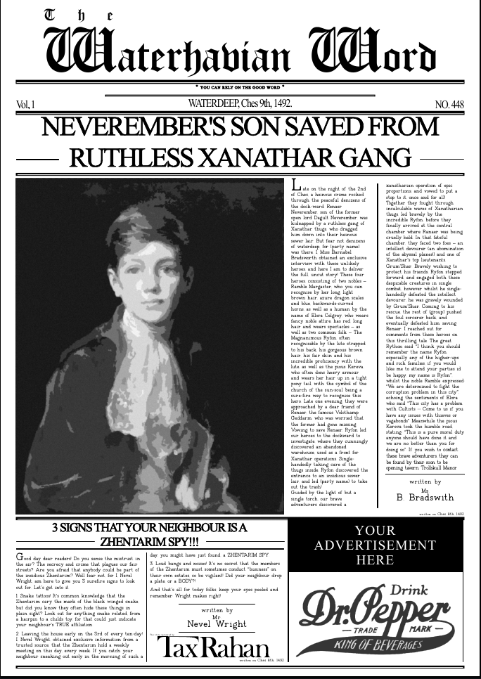 this section goes over multiple newspapers created to be used in a Dungeons and Dragons campainm each used to inform the player about the overall world and recent events in an imersive format.